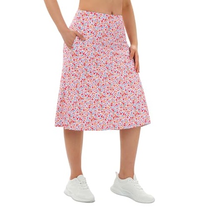 Midi Length Skort Skirts for Women Modest Knee Length Skorts Athletic 26″ Long Skirts with Zipper Pockets(Redfloral,L)