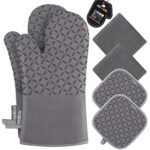 KEGOUU Oven Mitts and Pot Holders 6pcs Set, Kitchen Oven Glove High Heat Resistant 500 Degree Extra Long Oven Mitts and Potholder with Non-Slip Silicone Surface for Cooking (Grey)