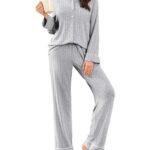 Ekouaer Womens Pajama Sets Long Sleeve Ribbed Knit Lounge Set Button Down Soft 2 Piece Pjs With Pockets Light Grey M