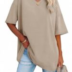 ATHMILE Womens Summer Oversized Shirts V Neck Plus Size Spring Workout Tops Beach Vacation 2025 Gym Clothes Khaki