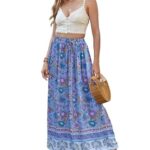 Bluetime Women Floral Print Long Skirt Boho Summer Pleated Elastic High Waisted Casual Maxi Skirt (M, Very Peri)