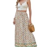 Bluetime Women Floral Print Long Skirt Boho Summer Pleated Elastic High Waisted Casual Maxi Skirt (M, Dark Green)