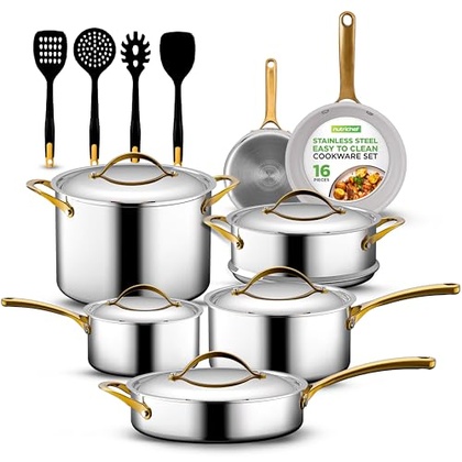 - 16-PIECE SET: This Kitchenware Pots & Pans set includes 1.5qt & 3.0qt saucepan pot with lid, 3.4qt saucepan with lid, 8qt stockpot with lid, steamer insert with lid, 8” & 9.5” fry pan, slotted spatula, pasta server, slotted ladle, and a turner