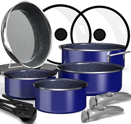 • COMPATIBLE WITH ALL COOKTOPS: The kitchen pots and pans set features a highly responsive magnetic base with an anti-warp stainless steel plate, ensuring optimal performance on induction cooktops. Thanks to the removable handles, each piece easily fits into the oven. It’s also fully compatible with gas, electric, ceramic, halogen, and portable outdoor stoves, offering exceptional versatility for all your cooking needs