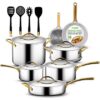 - Induction Compatible – 4.8mm thick stainless steel pan bottom makes this cookware set suitable for all stovetops. Die-cast aluminum construction allows the pan to heat up quickly and evenly, keeping the heat consistent. No warping and durable.