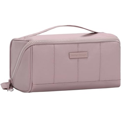 NISHEL Travel Makeup Bag for Women, Fluffy & Lightweight Open Flat Cosmetic Organizer with Multiple Functional Divider for Brush Independent Storage, Handle for Easy Portability, Peach-Pink