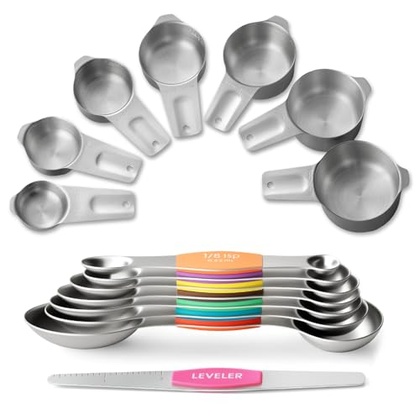 - 15-PIECE MEASURING CUPS & SPOONS SET: This all-in-one set blends long-lasting performance with everyday convenience, crafted from food-grade 304 stainless steel. It includes 7 measuring cups (1 cup, 3/4 cup, 2/3 cup, 1/2 cup, 1/3 cup, 1/4 cup, 1/8 cup), 7 measuring spoons (1 Tbsp, 1/2 Tbsp, 1 tsp, 3/4 tsp, 1/2 tsp, 1/4 tsp, 1/8 tsp), and 1 leveler. Perfect for both cooking and baking, this versatile multi-size set ensures precise measurements of dry ingredients and liquids, taking the guesswork out of your culinary creations.