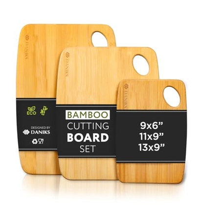 • 🟩 SET OF 3 SIZES Comes with three bamboo boards: 9×6″, 11×9″, and 13×9″. Perfect variety for all kitchen tasks—small for fruits and cheese, medium for bread and veggies, large for meat and fish. Made from eco-friendly bamboo, these boards help support a clean planet and a sustainable future.
