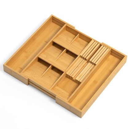 • Expandable Design – The width of this cutlery organizer is designed adjustable from 12”to 19.7 in to fit cabinet drawers of varying sizes. When expanded, compartments on both sides can hold large utensils like spatulas and ladles.