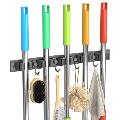 - Wide applications: The broom storage organizer is designed to hold various household objects to save space and decorate. Itβs large enough to hang your brooms, mops, racks, rags, brushes, gloves, baseball bats and so on. Suitable for kitchen, bathroom, garage, laundry, broom closet, washing storage and even works outdoors or in the shed for your garden tools!