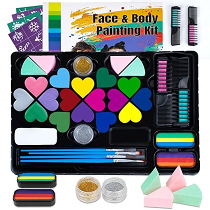 • Creating Fun with Our Face Paint Kit for Kids: This face painting kit refill 18 intensive pigmented colors that applies easily with sponge or brush: NOW INCLUDES FREE BONUS RAINBOW FACE PAINT CAKE, 2 hair chalks, 32 reusable face paint stencils, 16x5g vivid water-base face paints color (included 4 UV reactive colors ), 2x8g larger black & white color, 2 body glitter, 4 NEW IMPROVED PROFESSIONAL FACE PAINT BRUSHES, 4 makeup kit sponges. Absolutely everything you need.