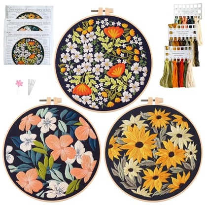 • COMPLETE KIT: Includes 3 embroidery hoops with pre-printed floral patterns on black fabric, plus all necessary threads and basic supplies for stitching.
