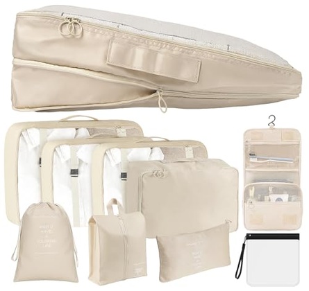 • 9 Packing cubes Set: Compression packing cubes have 3 sizes to meet all your luggage storage needs, including M, L, XL travel compression organizer bag. The XL compression cubes hold jackets, coats, sweaters. The L packing cubes hold shirt, long sleeves, denim. The M packing cube holds T-shirts and other lightweight clothing. Also includes 1 x Underwear bag; 1 x shoe bag; 1 x portable hanging Makeup bag; 1 x dirty clothes bag; 1 x small utility bag and 1 x clear waterproof liquid bags.