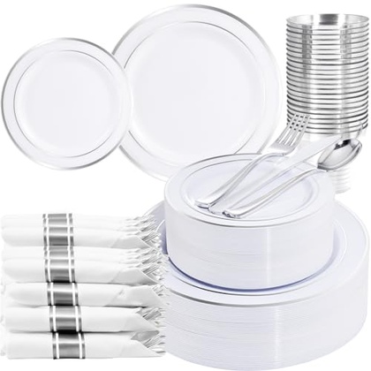 - BPA FREE – These disposable plates and napkins party supplies are made of food-grade, reusable plastic that is non-toxic and BPA-free. If you need to reuse the wedding plates with silver rim, simply wash these party supplies with water. Note: These party plates aren’t recommended to be placed in the microwave or dishwasher.