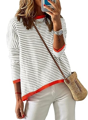 • Features:Orange trim lihgt grey and white striped sweater, long sleeve pullover,matching color sweater,all-matching sweater, boat neck,color block, ribbed knit, basic,loose fit women sweaters, casual sweaters