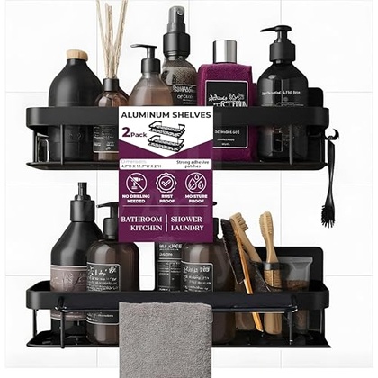 - Sleek and Stylish: Add a modern touch to your bathroom with our floating shelves and black shower caddy. Featuring a durable shower holder and shower storage for inside shower, these bathroom wall shelves provide a no-drill solution for organizing your space without damage