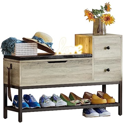 - 【Organized Storage Space】 A flip top storage box combined with 2 drawers allows you to store both large item(out-of-season shoes, blankets, toys) and small things(keys, earphones, pet equipment), which will make your entrance tidier. No wasting time arguing looking for things before going out!