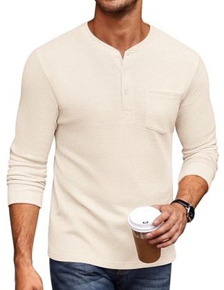 - 【CLASSIC DESIGN】The basic crewneck tee shirt for men with henley style, featuring 3-button Placket Closure, Waffle Pattern, Beefy Long Sleeve, Regular Fit, Ribbed Knitted Cuff & Hem, Chest Pocket,Plain, V Neck. Classic and durable fall long sleeve shirts.