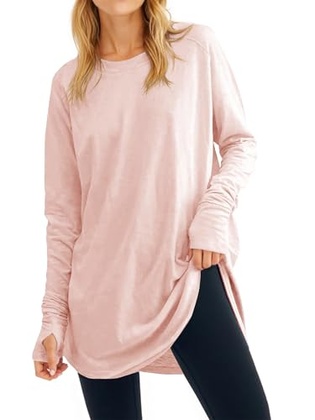 Fisoew Women’s Casual Long Sleeve Tops Crew Neck Round Hem Loose T-Shirts Tunic Tops with Thumb Holes Pink