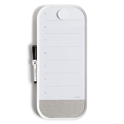 • WEEKLY VIEW: From schedules to meal planning, keep track of tasks and events effortlessly with the weekly calendar view; features white rounded frame and built-in linen bulletin strip to pin ideas and important notes; includes marker, clip, and magnet