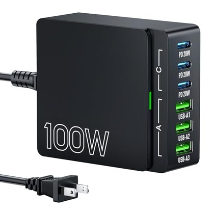 - 【Fast Charging】This product features 3 Type-C ports and 3 USB-A ports, with a total power of 100W. Only the Type-C ports support fast charging (max 20W per port), while USB-A ports do not (max 15W per port). Fast charging is limited to smartphones and tablets; older models may not be compatible, so check your device’s specifications first. A certified fast-charging cable is also required for fast charging with compatible devices.